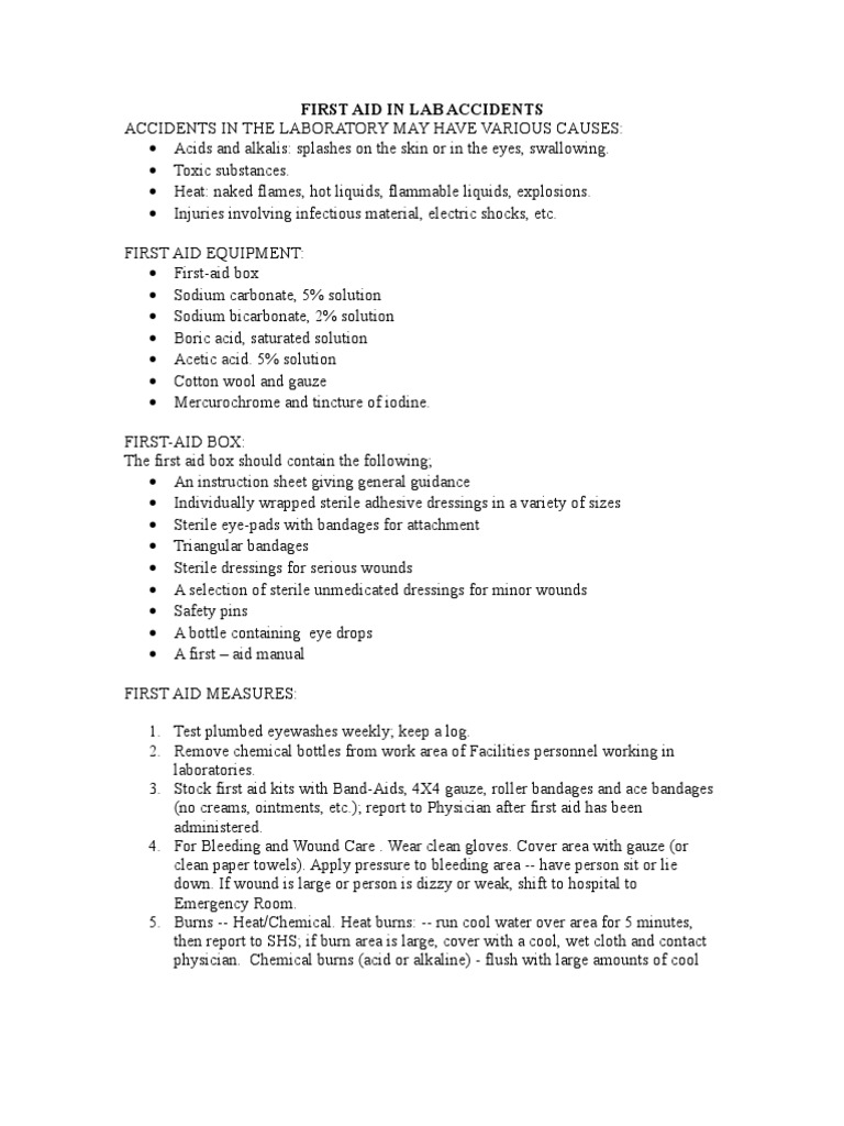 First aid in the science laboratory. Safety in academic chemistry laboratories. All safety procedures and precautions followed in the microbiology laboratory are designed to 2. Additionally, reduction of accidents and injuries would occur when one knows and incorporates proper laboratory etiquette. First aid equipment an adequately equipped first aid box should be kept in the laboratory, in a place that is known and accessible to all members. Fully explain the safety procedures to all of your students. Microwave ovens, ultrasonic cleaners describe institutional policy related to providing first aid for laboratory accidents. In the present article emergency steps and measures that should be taken in case of other laboratory accidents are discussed. A lab accident/ incident report must be completed. When first entering a science room, do not touch any equipment, chemicals, or other materials in the laboratory area until you are instructed to do so. Learn vocabulary, terms and more with flashcards, games and other study tools. Laboratory rules,accidents in lab & first aid first aid 1. Most laboratories have a plan to follow in the event of an accident.