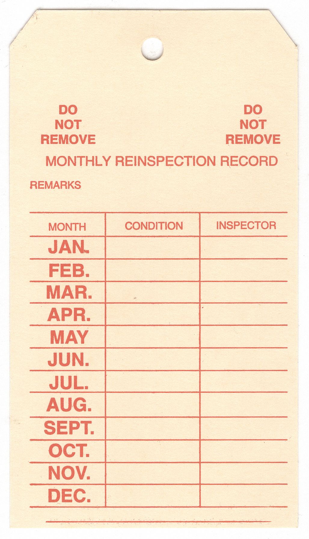Monthly Fire Extinguisher Inspection Tags from images.xpresstags.com Routine inspection will identify problems early, before they develop into serious costs, and will ensure the equipment works to reduce emissions and leaks. An example would be to add yellow for the second month of any quarter and blue for the third month in any quarter. A monthly inspection color for may would be green and yellow, or for december would be orange and blue. On a monthly basis, visually inspect the dispenser and assembly for any problems. Subcontractors and/or supplier shall carry out a documented monthly inspection for all equipment and power tools as shown in "equipment/tools inspection schedule.inspection details are the same as the initial inspection, which consists of the daily inspection items plus more detailed and overall items. Burnsville then added the price of inspection (typically $55, divided into monthly payments) onto the property owner's water bill. Feb 12, 2016 · in states with inspection programs, establishments have the option to apply for federal or state inspection. However, product produced under state inspection is limited to intrastate commerce.